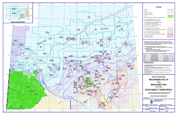 Showing Oil & Gas Dispositions (Exploration, Production & Significant Discovery Licenses) in the MacKenzie Delta & Beaufort Sea NWT (one side) and Mid-Mackenzie Valley NWT & Eagle Plains Yukon (other side). These maps also show Aboriginal Traditional Territories/Settlements & Aboriginal Surface/Sub-Surface Ownership.
