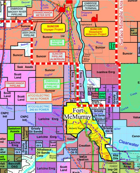 Alberta Oil Sands Projects Lease Area Map showing Oils Sands Lease Areas, Major Pipelines, Major Power Lines & Oil Sands Plant Sites within the Athabasca Area. This map is available in the following scales:
